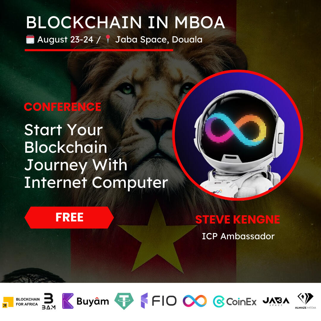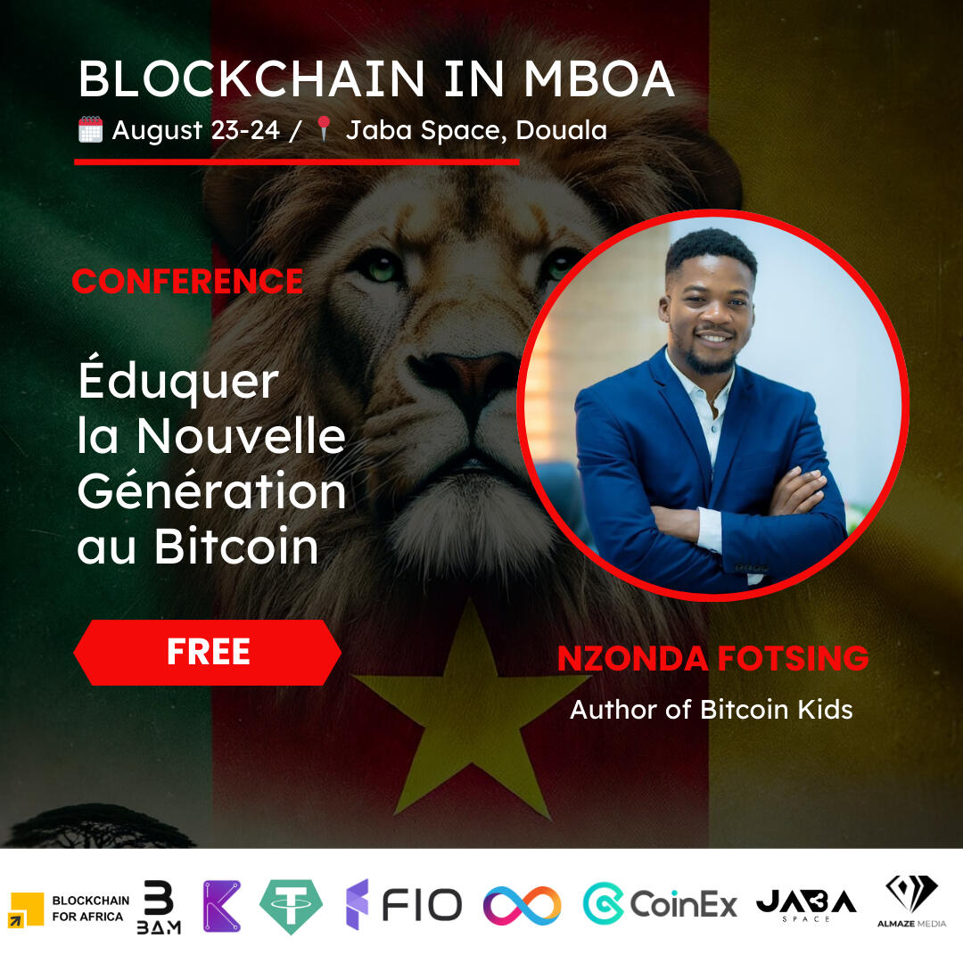 12:30 Doors opening13:00 Welcome speech13:15 How Blockchain Reinvents the Internetwith Kinlesen Collins Ghani, tech-preneur& blockchain educator13:45 Éduquer la Nouvelle Génération au Bitcoin with Nzonda Fotsing, author of Bitcoin Kids14:15 Comment Saisir les Opportunités Crypto en 2024 with Steve Tiwa14:45 Le Guide Ultime pour Maîtriser les NFTs, Airdrops & Memecoins with Karine Bessongo15:15 Start your Blockchain Journey with ICP with Steve Kengne15:45 Comment la Blockchain Transforme les Modes de Vie Dans les Pays Africains with Cedric Moudze Co-Founder & CEO @ Namsoft16:15 La Blockchain au Service de la Valorisation du Travail des Femmes au Foyer with Georges Foaleng, CEO de Frontières-Sarl